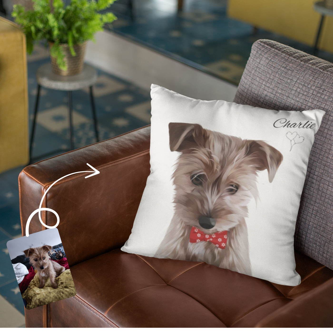 Deeply Personal – Customers provide their pet photo, our artists transform it to a hand drawn pet which our design team print to the pillow